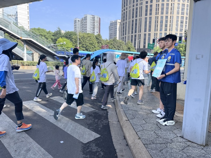 清晨,同学们准时抵达青年广场站点投入工作。他们分工明确,面对高温与人流,义工团队展现出强烈责任感和协作精神。同学们坚守岗位,耐心解答疑问主动观察需求。24交通团支部认真细致的服务和高效有序的操作,保障了服务点顺畅运行,获得主办方工作人员与徒步者一致好评。