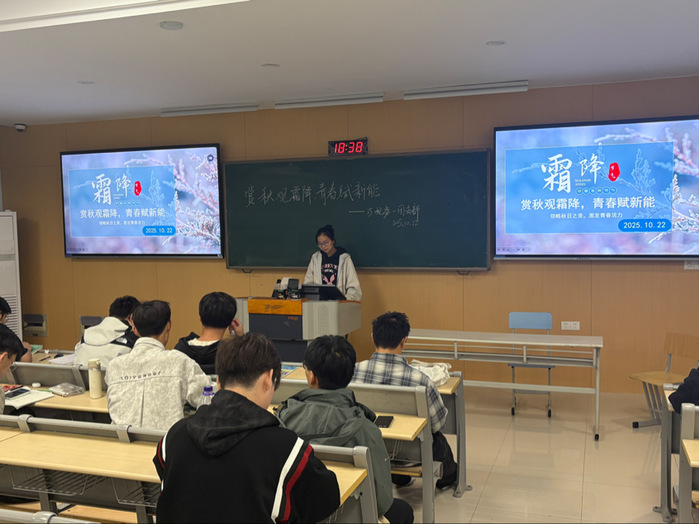 品韵节气:物候通古,民俗叙今。谈“豺祭草木”之变,话“食柿赏菊”之趣,诗韵裹烟火,古俗焕新声。同学们或引“霜叶红于二月花”之句抒怀,或叙家乡秋日食俗共情,共话霜降物候,从“草木黄落”的自然之变,到“吃柿子、赏秋菊”的民俗之趣,古意裹着烟火气,让千年节气在青春笑语里鲜活落地,让节气不再是书本上的文字,而是可感、可谈、可共情的生活记忆。