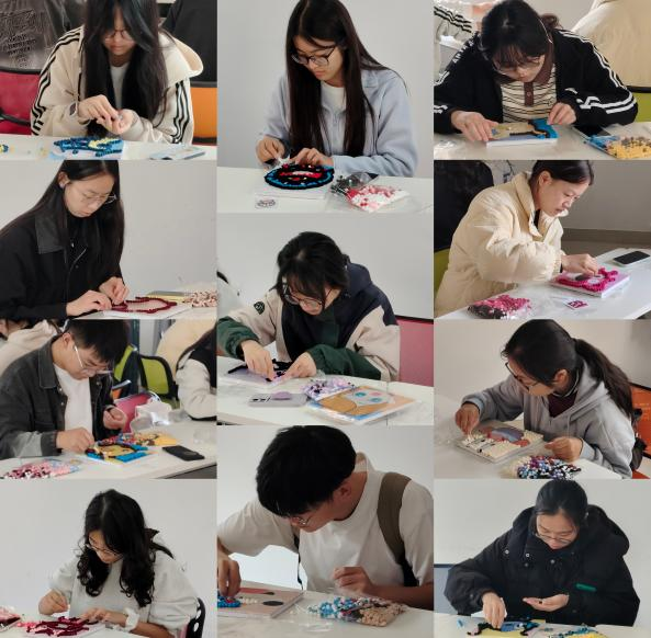 活动现场,色彩缤纷的毛球瞬间点燃了同学们的创作热情。大家专注于指尖的方寸天地,将一颗颗柔软可爱的毛球精心粘贴在画布上,逐步拼凑出独具匠心的绚丽图案。整个过程轻松而愉悦,同学们在交流协作中增进了情谊,在专注创造中沉淀了心绪,有效疏解了日常的学习压力与焦虑。