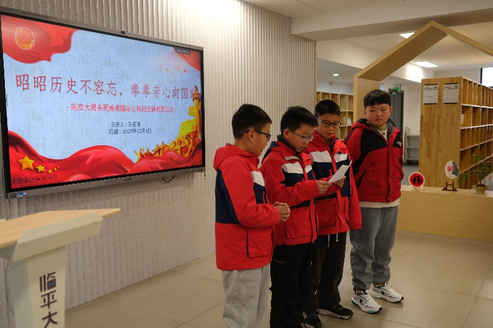 活动在庄严的氛围中拉开帷幕。主讲同学以图文并茂的课件、真实客观的史料、精心挑选的视频,向同学们讲述了南京大屠杀的历史背景与基本事实,在揭示历史伤痛的同时,强调了国际友人的人道主义举动,启迪同学们认识到和平的珍贵与生命的尊严。在互动环节,小朋友们踊跃举手、积极互动,对国家公祭日的意义、南京大屠杀的历史真相有了更深刻的认识。在朗诵环节,小朋友们诵读了《历史的回响》《光的见证》《未来的誓言》等篇章,他们用铿锵而真挚的声音,表达了铭记历史、珍爱和平、立志报国的坚定决心。最后,全体师生肃立,发出“铭记历史、珍爱和平、努力学习、报效祖国”的庄重誓言。